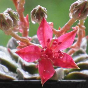 グラプトペタルム・キングスターさんのお花さんが咲きました😻💗🤍💚 去年の長雨と暑さで株さんを縮めちゃったので お花さんと蕾ちゃんの数が少ないです😺💧