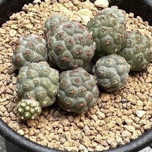 7/1にお迎えしましたと投稿したプナ属(現テフロカクタス属)、ボンニアエ。 私が周囲から聞いたり調べたりしたところ、この子は動きが遅く、夏よりは冬が得意で、真冬はもとより、夏場にも休眠することがあるそうなんですが、以前の投稿画像と見比べ一目瞭然、この、真夏か?と言うほど暑い中、せっせと動いてるみたいです。 左手前の玉の端っこ、お迎えした時からなんか棘付近に違和感あるな?と見守ってましたら、新しい玉を吐き出す直前だったんですねぇ。 確かにある程度育った玉の一つ一つはそれほど動きを感じませんけれど、若い子が育つ速度は案外早いんですね。 ぱっと見、特に問題なく我が家に馴染んできたようですし、これなら来年春に花芽を期待できるかな〜?
