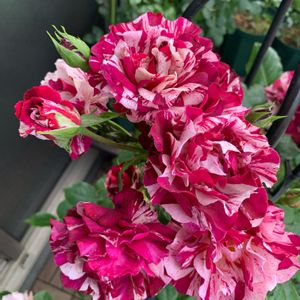 咲きました♪ ニューイマジン デルバールの薔薇 赤紫と白の絞りにひらひらウェーブ たまらなく妖しげ✨ 地植えで何年目だろ? 病気知らずで優秀なのだけど、今年は台木ノイバラのぶっといのが2本もニョキニョキ出てきたので、根元付近でバッツリカット✂️強いなぁノイバラ。また出てきたらカットしなきゃ。 玄関横で、ひときわ目を引くお花です🌹