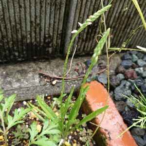葉はスイセンやニラの様な感じだけど、長くても10cm 幅8mmくらい。花?つぼみ?は白く2mmくらいです。 もし詳しい方、思い当たる方居れば宜しくお願いします。