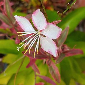 夏の間は花は白く葉も緑でしたが、秋になって花は赤い縁取りを施し、葉も赤くなってきました。