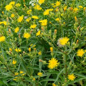 お山の黄色い花🌼🌼🌼 1️⃣2️⃣ハンゴンソウ(反魂草) キク科 ヤコバエア属(元キオン属) 山地の湿地、草地に生える多年草で花期は7〜9月.高さ1〜2m 名前の由来はちょっと怖いのですが、深く切れた葉の裂片が、幽霊の様に下に垂れ下がる事から、魂を呼び戻す「反魂」と名付けられた説 薬草で瀕死の人が蘇った、強い香りで死者が蘇った説と諸説あります 花を見るからには、全くそんなイメージは湧きませんね 高い草と低い草があって、高いものは高すぎて花が見えないので下の花を撮りました 3️⃣オトギリソウ(弟切草) オトギリソウ科 同属 これまた、名前の由来は怖いもので、薬草の秘密を漏らした弟を兄が殺したという説 4️⃣ダイコンソウ(大根草) バラ科 ダイコンソウ属 5️⃣コウゾリナ(剃刀菜) キク科 コウゾリナ属 茎から総苞に黒い剛毛があり、髪剃りからきた名前 これまた恐ろしい名前