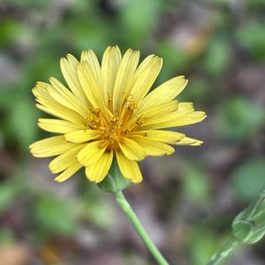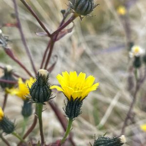 コウゾリナ(髪剃菜) 綿毛 ○稲刈りを終えた畔の枯れ草に黄色い可愛いお花が🌼 キク科コウゾリナ属の越年草(二年草)または多年草。 ヨーロッパ原産の帰化植物。 日本の野原や道端でふつうに見みられる野草 別名:カオソリナ、タンポポナ。 花期: 5-10月 コウゾリナの特徴: 全体に褐色の毛がびっしり生えている。 若いときはやわらかく、生長した茎葉では毛が硬くなり、触るとざらざらした感触がある。 そのため、多くは葉の中心軸が赤褐色を帯びている。 葉には根出葉と茎につく葉があり、根出葉は開花時には枯れている。 茎につく葉は互生する単葉で茎を抱く特徴が。 葉身は長さ8 cmほどの披針形である。 総苞外片は短く、ともに剛毛が生える。 花は直径約2.7cmほどで花は舌状花のみ。 舌状花は長さ約7mmの冠毛がある。
