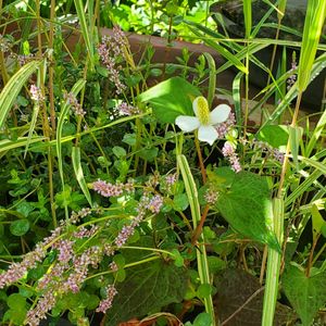 荒れ放題の小型ビオトープ 腰水状態のクランベリーが、かなりモジャモジャな中、ロタラロトンジフォリアの紫とドクダミの花がキレイです❗ 水槽もキレイにしたいけど、時間がないわ…