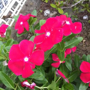 スーパーへ向かう途中のマンションの植え込みに咲いているニチニチソウ