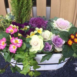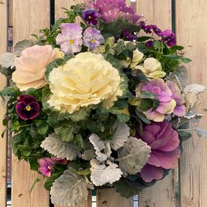 5日のハンギング 講習会を終えてやっと自分のハンギング を作りました😊 久しぶりのSLT。苗は14苗。クリスマス、お正月を華やかにするフレアホワイトが大好き❤ 葉牡丹はフレアホワイト、フレアローズ、小さなのはデュエット パンジーは絵になるすみれ、ミュール