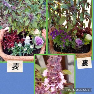 寄せ植え 表と裏とバジルの花が咲いてたのを 撮りました。 表側 中央にバジルとコプロスマ 葉牡丹4株を2株に分けました。 アリッサム2株です。 裏側 リナリア バイオレット 葉牡丹2株 おはようございますm(_ _)m 今日は☀マークです。