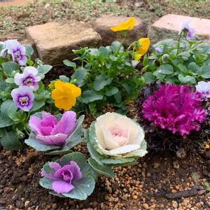 +。:.゚ஐ⋆*♡・:*💜💛ビオラの寄せ植え+。:.゚ஐ⋆*♡・:* お出かけ先にて♪ 変わった葉牡丹?だったので撮らせて頂きました💛💜 明朝、研修の為に朝早いのでコメント欄閉じます🙇♀️ おやすみなさい+。:.゚ஐ⋆*♡・:*ೄ‧͙·*♪