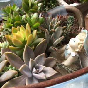 紅葉が少ない分だけ月の王子⁉︎ の黄色ぽいライムカラーが際立っ て見える〜〜╰(*´︶`*)╯♡ これは大きな鉢の寄せ植え💚 単なる寄せ植えに妖精が加わって メルヘンな世界観が生まれる〜〜✨✨