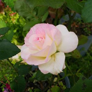 おはようございます✨ 雨は小康状態。風は強く、今朝も鉢がいくつか倒れていました😱 そんな悪天候の中、昨年からの挿し木のバラがつぼみから開花🎀 数少ない私のミニバラでないバラ、ストロベリーアイスです。 昨日投稿の時は開きかけのつぼみでした❣️