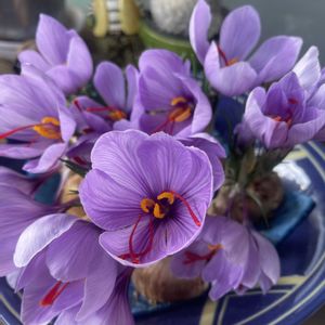 こんにちは😃水や土がなくても咲く不思議な花。 サフランの花がお皿の上で咲きました。 赤いめしべを摘み取り、陰干しして乾燥して保存します。 ハーブティーやパエリアに使用出来ます😃