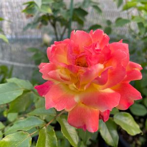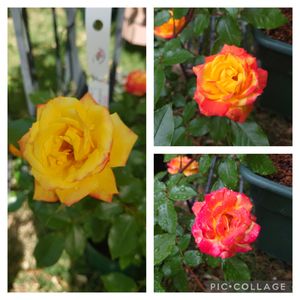 最初は黄色から始まり縁から色づいて最後は赤っぽくなって咲く。色変化が楽しいバラ ☺️