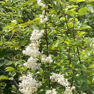初めての出会いです。 とても素敵に咲いていました♪♪ 近畿以西とありますが、ここは植栽ではなく自生のようです。 アサガラ(麻殻) エゴノキ科 アサガラ属 落葉高木 近畿以西の本州、四国、九州に分布。 葉は長さ7~13㎝の広楕円形で、互生。縁は細かな鋸歯、先端は尖る。 花はエゴノキやハクウンボクに似る。 花序が分岐して横に広がる性質を持つ。白い小花は先端が深く5つに裂けるが、基部がつながった合弁花で下向きに咲く。 花期5~6月 福島県中通り南部 6月6日撮影