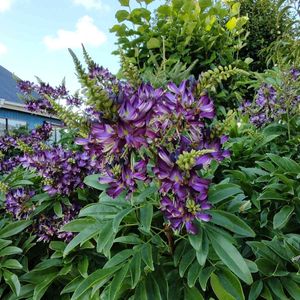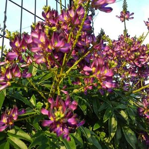 雨☔️が 続くそうですね☔️☔️☔️ 二日前に 撮った 青空☀️と たぶん😅「ムラサキナツフジ」です。 花の赤紫色が とても強烈です✨ ……メモメモ✍:…… 中国南部原産。花は赤みがかった紫色。 夏に房状の花を上向きに咲かせる。 サッコウフジとも呼ばれます。