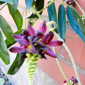 この花はムラサキナツフジ(紫夏藤)です。 夏に紅紫色の蝶形の花を咲かせることからそう呼ばれています。 房状の花は藤と違って上向きに咲き 蔓も藤ほどには伸びません。 花後にはインゲン豆のような細い鞘の実を付けますが 硬くて食べられません…。 台湾・中国南部原産。 マメ科ナツフジ属の蔓性落葉低木。