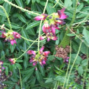 近くの植え込みに咲いていて、毎年気になっています。 これは何という植物? 藤のような マメ科でしょうか。