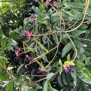 ムラサキナツフジ(紫夏藤) 別名: サッコウフジ(酢甲藤) 花言葉:「決して離れない」「優しさ」「陶酔する恋」 南国出身らしいお花は 暗紫色から紅紫色に変化しながら 降り注ぐ西陽に 艶やかに映えています。