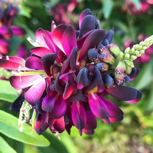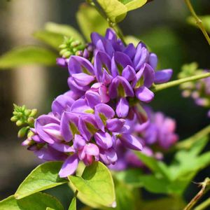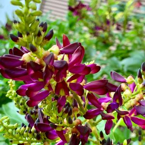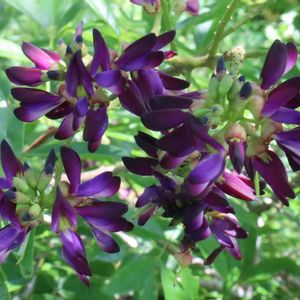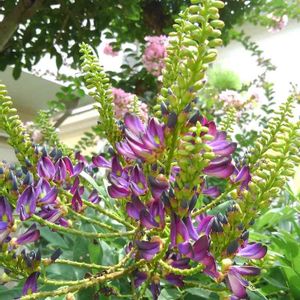 ⚘ サッコウフジ ( ムラサキナツフジ ) 庭のサッコウフジが咲きました 上に向かって咲く夏藤 青い空に紫色の花が咲く姿は美しいです