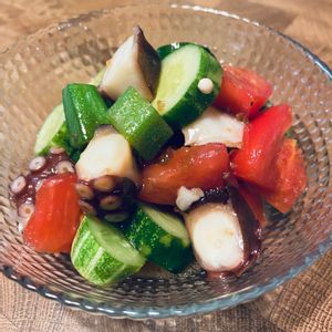 本日初収穫いたしました聖護院きゅうりと、トマト、オクラにタコを混ぜました🥒✨味付けは、韓国チョレギドレッシング的なかんじ👏美味しい🤤🤤🤤❣️