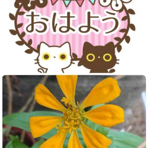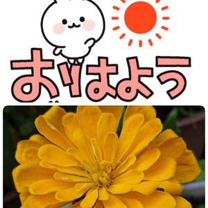 『百日草』 大きな黄色い百日草が 咲きました‼️ 今は百日草とダリア、コスモスが元気に咲いています👍 おはようございます☀️ 今日も晴れ☀️ 爽やかな朝です‼️ 元気に頑張りましょうね‼️