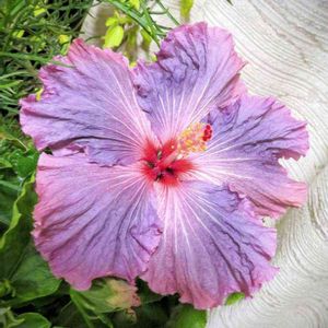 明るい花色のハイビスカスが多い中で、アンティークカラーの珍しいお花です。涼し気なブルーがひと際目を惹くハイビスカスのデニムブルーさんです。