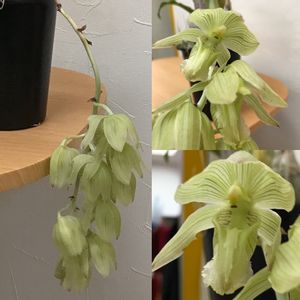 🌸クロウェシア ルッセリアナ🌸 開花間近😊 何度も株分けした古株のルッセリアナです😊 リップにあたる部分が膨らみストライプがハッキリ出てきました🧐 クロウェシア独特の垂れ咲きで香りもありライムグリーンにストライプが浮かびます🧐 🆖 水苔が古くなると害虫の棲家になったり菌、カビ、ウイルス発生のリスクが高くなります😥 水苔の最大のメリットは保水性ですが逆にそれがデメリットにもなります💧 4A以上でも最低でも二年に一回は植え替えして下さい🧐 水苔が古くなると根腐れ、病気の元😣