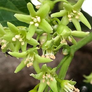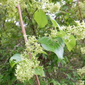 ツルウメモドキ(ニシキギ科ツルウメモドキ属) スイカズラの写真を撮ってると下の方に緑のお花が咲いてました。 調べたらツルウメモドキのようです。 とっても小さなお花ですが、星型が可愛いですね。 雌雄異株で、雄花をつける株と雌花をつける株があります。 葉の脇に小さな黄緑色の花を10個くらい集散花序につけます。 集散花序というのは、初めに主軸の先端に花がつき、その下から枝分かれをして出る側枝の先端に次の花をつけ、この枝分かれを繰り返す花のつき方です。 花びらは5枚、萼も5枚、雄しべは5本である。 雄花の雄しべは長いが、雌花の雄しべは短く退化しています。 🏷 木曜日は木
