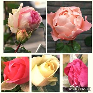 庭にいたら、こんな時間になっちゃった😂 日頃エアコンの中の生活だからビショビショに汗をかくのも気持ちがいいかも~🎵 もちろんちょこちょこ休んで水分補給です🎵 トロイメライ🌹 ピンクだったりアプリコットっぽかったり🎶 咲いてるのまとめてコラージュしてみました🎵