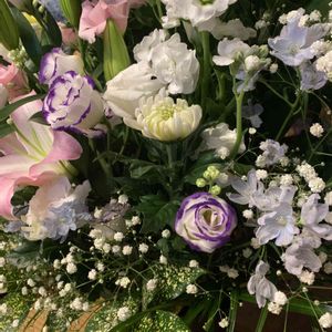 お友達のお母様のお別れの会に。メインカラーはピンクと白と聞いていたので、ティッシュペーパーにピンクを少し入れてもらいました。 ギフトの際は、花瓶かバスケットにアレンジされたものが、移動も楽ですね。