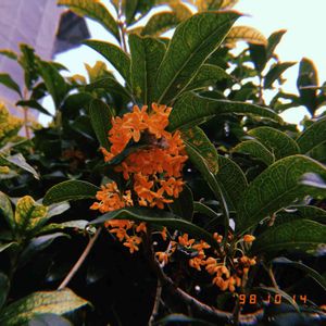 キンモクセイ🍃 今が満開できれいに咲いているからと スマホを構えたら、その先に💛 真ん中に小さい葉っぱで、なんか 可愛い😍💛