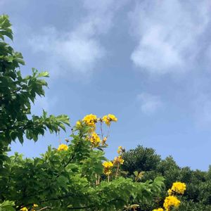 2022/4/1 宮崎にて 桜は早くも葉桜になりかけてましたが、この黄色い花が、快晴の空に映えてました😄 Q