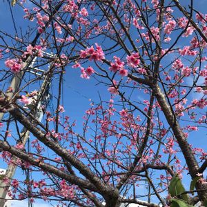 🏷半分そら 参加しま〜す🟦🌸 裏庭の寒緋桜やっと7分咲き🌸 小鳥が嬉しそうに飛び交っていました😊 2階からスマホ手を伸ばしてやっと撮れる高さのテッペンのお花🌸陽を浴びて誇らしげ🌸 遠くで輝いているのは、花ブロックで囲まれたステンレスの水タンク 夏の断水期用です。沖縄煙突に見えるのは ほぼ水タンクです。 2022/2/9 沖縄県那覇市首里にて 今朝撮れ撮れです🌸
