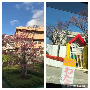 🏷土曜はお空の発表会 🏷半分そら 🌸と🟦で参加させてね💚 どちらもお世話になった場所 左は 昨年8月末に天国へ行った父が亡くなる直前迄通っていた、 デイサービスの施設のお庭の真ん中に生えている桜の木、 満開の寒緋桜の下で昨年2月5日に、満面の笑顔で、万歳している写真を連絡ノートに貼り付けて下さったのを、写メして時々見ていますと🌸😊🖼先日お礼に伺ったら、どうぞ見ていって下さいとお庭&写メ許可をいただきました。 右は 信号待ちの車窓から写メしました。 20年以上前に子どもたち2人が通っていた公立小学校併設幼稚園、今は認定子ども園になりました。 この桜の下に遊具があり、お迎えの後しばらく遊び、ママ友さんと仲良くなったところです🌸😊 介護と、子育てどちらも人との繋がりで心を軽くするのは似てますね💕 GSの皆様との繋がりでも、随分心を軽くしてもらいました😊 感謝💕感謝の日々です🌸 2022.2.9&11 沖縄県那覇市にて