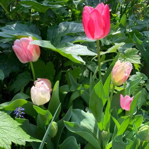 ピンクのチューリップ 大きな葉っぱに押されながら 咲きそろってきました 🌷🌷🌷