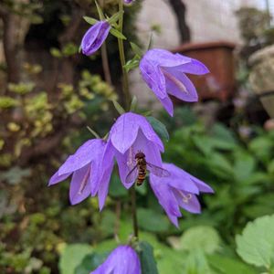 カンパニュラ💜 なの?… 通勤途中で出会って、だいぶ前から咲いているのですが名前がわかりません カンパニュラに似ているけど今でも咲く花なの?🤔 🐝さんが一生懸命蜜を吸っていました。冬支度かな?