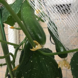 安全対策をしつつ、今日収穫しました。前回の鳥に食われた物より小ぶりですが、一丁前のキュウリに見えます。 何となく可愛くて笑っちゃいます。