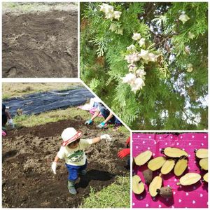 種芋の植え付け終了‼️品種はアンデスでした🙋 大きなお姉さんたちは率先して作業してくれたんだけど、どう見ても息子が邪魔してるし旦那が役に立ってない… 破傷風予防のためゴム手袋の上に軍手をしたのであっついのなんの😩💦 結局5つくらい植わらなくて、旦那に掘らせようと思ったんだけど何とかして来年に持ち越しとか言ってたけど(ヾノ・∀・`)ムリムリ