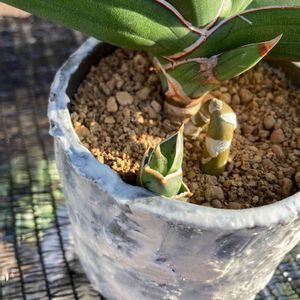 観葉植物まとめたバケツに入れたサンスベリア 入れる前に植え替えたら土の中に 親株としっかり太い根?で繋がった子株が出現👀💦 プラ鉢に丸ごと入れたのですが 親株が斜めに植ってしまったのでやっぱりカット✂︎かな? 土の中でどのくらい成長していたんだろう…苦しかったろうに😅