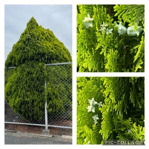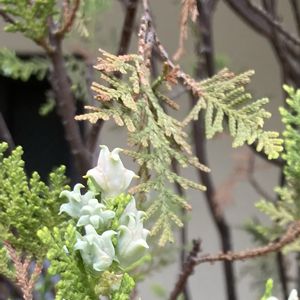 ●コノデカシワ よく見る植え込みのヒノキ科の植物。 これ、お花なんですってね。 触ってみたら硬い😯 でも、一つ一つ見ると、陶器のお花みたいで可愛です😄🎶 しかも、生育した葉と球果は薬用部位。 止血作用、下痢止め、不眠症、肌荒れ、滋養強壮など 学名: Platycladus orientalis (Der Morgenländische Lebensbaum)