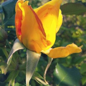 夕刻のコールドバニーが開き始めました~黄色い薔薇なのに少し赤い線が入ってます😅