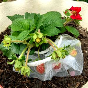 色づいてきた〜苺🍓排水口ネットで一応、鳥虫対策?大丈夫かなーこんなんで🤣👩🌾👩🌾👩🌾
