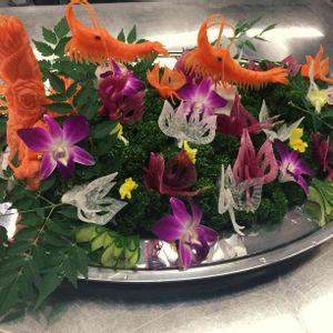 オープンキャンパスで、先生が作ってくれた見本。 人参と大根は分かるけど、あとは何の葉っぱとお花かな? 見本だから見てるだけだったけど、ドレッシングとかかけて食べたらいいのかな? 全部歯ごたえ良さそうな食材。