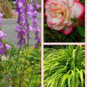 カンパ二ューラ、バラ,フウチソウ カンパ二ューラは、力強く毎年出てきますね フウチソウは、風に揺れて涼しそう😃