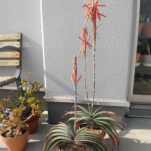 今朝のスプラフォリアータ 手前から1、2、3号 前回の投稿時は2号だけでしたが 1号にも花芽が😊 もし追いついてくれたら交配してみよう。 アロエの種は採ったことがない😅
