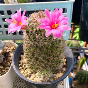 マミラリア属 オリビアエ 大きな方のオリビアエさんが猛暑にも負けず🌞今朝咲いていました🌸✨ 今年3回目の開花です😊 のっぽのさぼちゃんですが、子供もできて来年が楽しみです〜😄💕