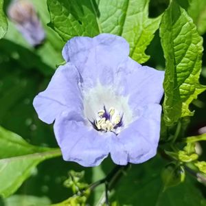 こんにちは😃 春蒔きしていた黒ほおずきが開花しました💜 花の後にほおずきに似た黒い果実になるそうです。 ドライにもできようなので楽しみです‼ 春の一年草を片付けて地植えする予定です🤗