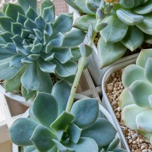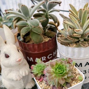🏷️ウサぴょん祭り 参加します。 全然、白くない💦☘️白兎 迎え時も、置き場所も違う☘️月兎耳…葉の厚みの違いも凄い😂 🤍💛ハニーヨーグルト また切り戻ししてたかな!?🌼ずっと楽しませてくれてます😊 天気予報により多肉☘️ちゃんの場所にいます😅