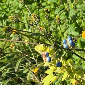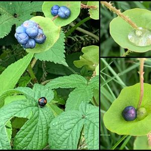 そして、帰りの林道歩きでは行きには見つけられなかったイシミカワを発見! 『托葉が丸くて、茎がつき抜く』か。なるほど✨ 黄緑の花も、青い実の中にあるという黒光りするタネ(知っていればなぁ、、)も面白いようですねー。 イシミカワ タデ科イヌタデ属 花期7-10月 湿って日当たりの良いところ(林縁や川原など)に生える。ツル性一年草。大きく育っていました。 10月18日 湯の沢峠⇄大蔵高丸