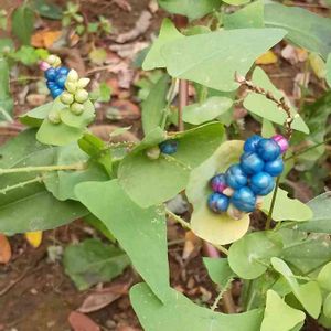 石見川/石実皮(イシミカワ) 道端や畦道などに生えるタデ科のつる性1年草。茎には下向きの刺があり、これがずり落ち防止のストッパーとして機能し、ほかのものに引っかかりながら伸びていく。 花は淡緑色で目立たないが、花後、萼が肉質に肥大して果実を包みブドウの房のようになり、赤紫色から瑠璃色へと変化して目立つようになる。三角形の葉とは別にある丸い托葉(たくよう💬葉柄の基部にある葉に似た付属物)の上に艶のある果実が載っているような姿が特徴的。ブドウを割ってみると中には黒い種がある。 名前の由来は諸説あり。秋の青黒い実は、外は萼で中の黒いのが実。石のような実に皮があるから付いた名前との説もある。 出典『都会の木の実・草の実図鑑』『散歩の草花図鑑』