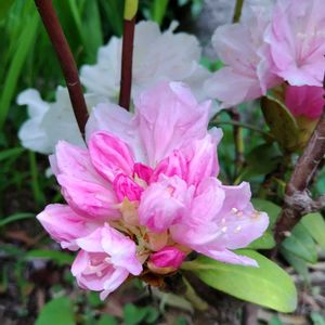 シャクナゲ (今日のお花) 70㌢程の苗木なのですが、 上の方には咲かず、地面の近くに咲いています。昨年は咲かず、今年も葉色が悪く元気なかったのですが、どうにか咲いてくれました🍀